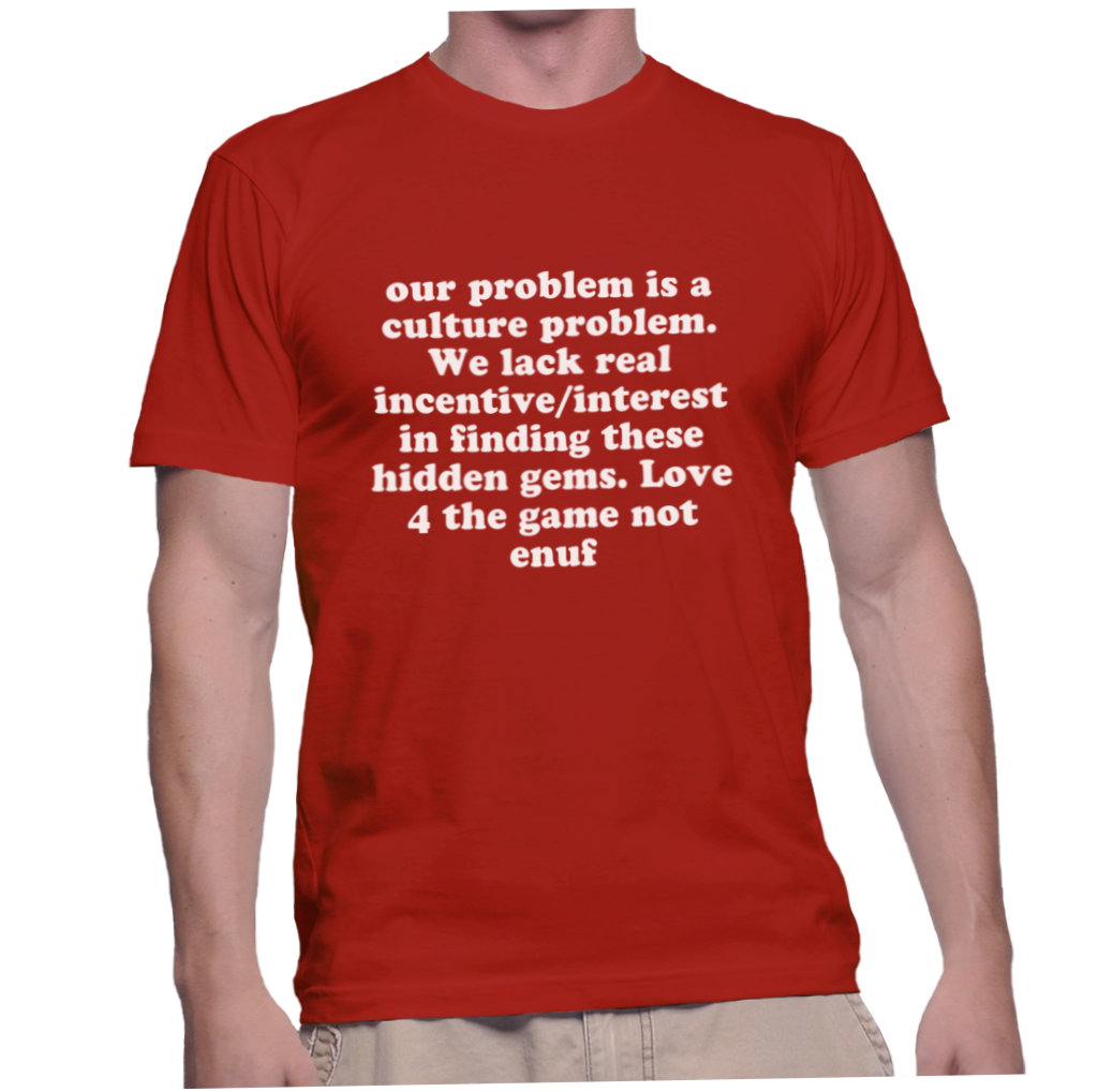 our problem is a culture problem. We lack real incentive/interest in finding these hidden gems. Love 4 the game not enuf