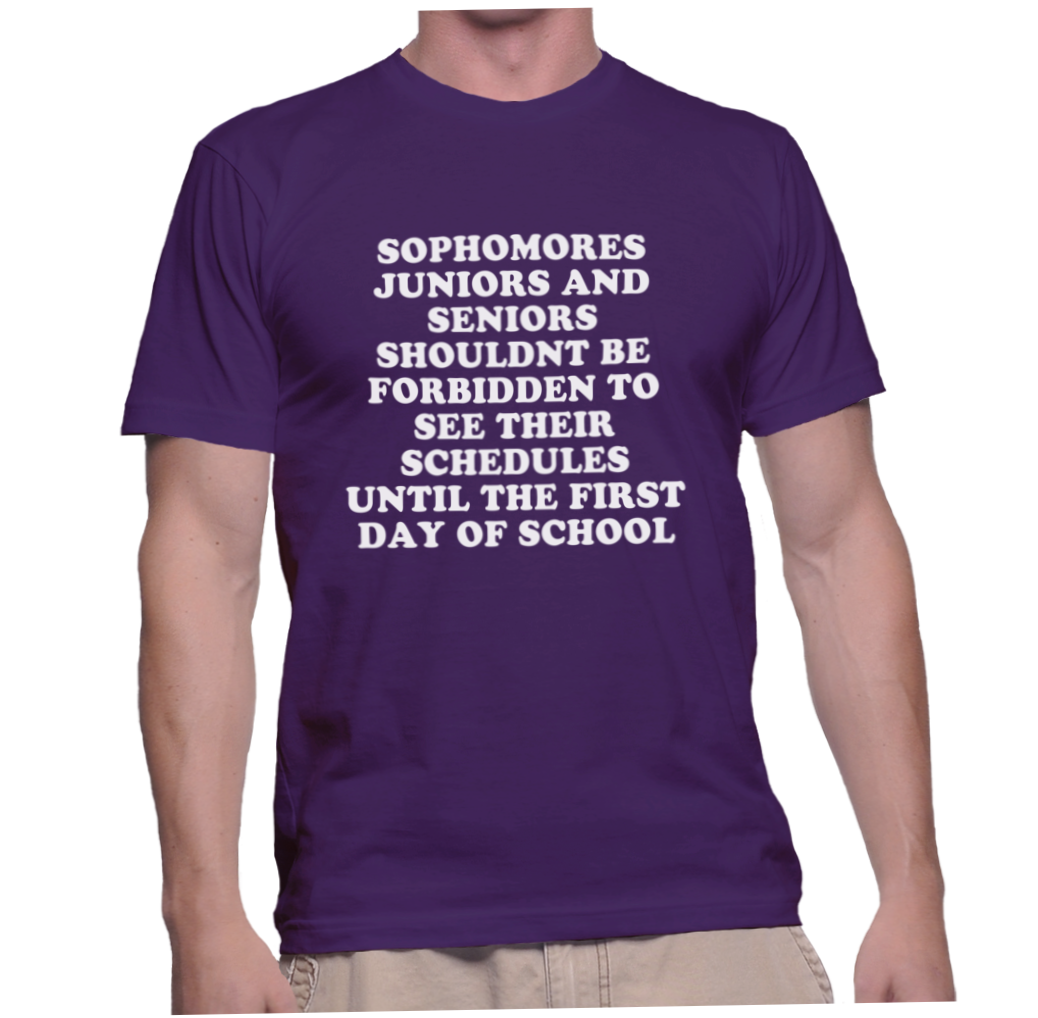 SOPHOMORES JUNIORS AND SENIORS SHOULDNT BE FORBIDDEN TO SEE THEIR SCHEDULES UNTIL THE FIRST DAY OF SCHOOL quantity